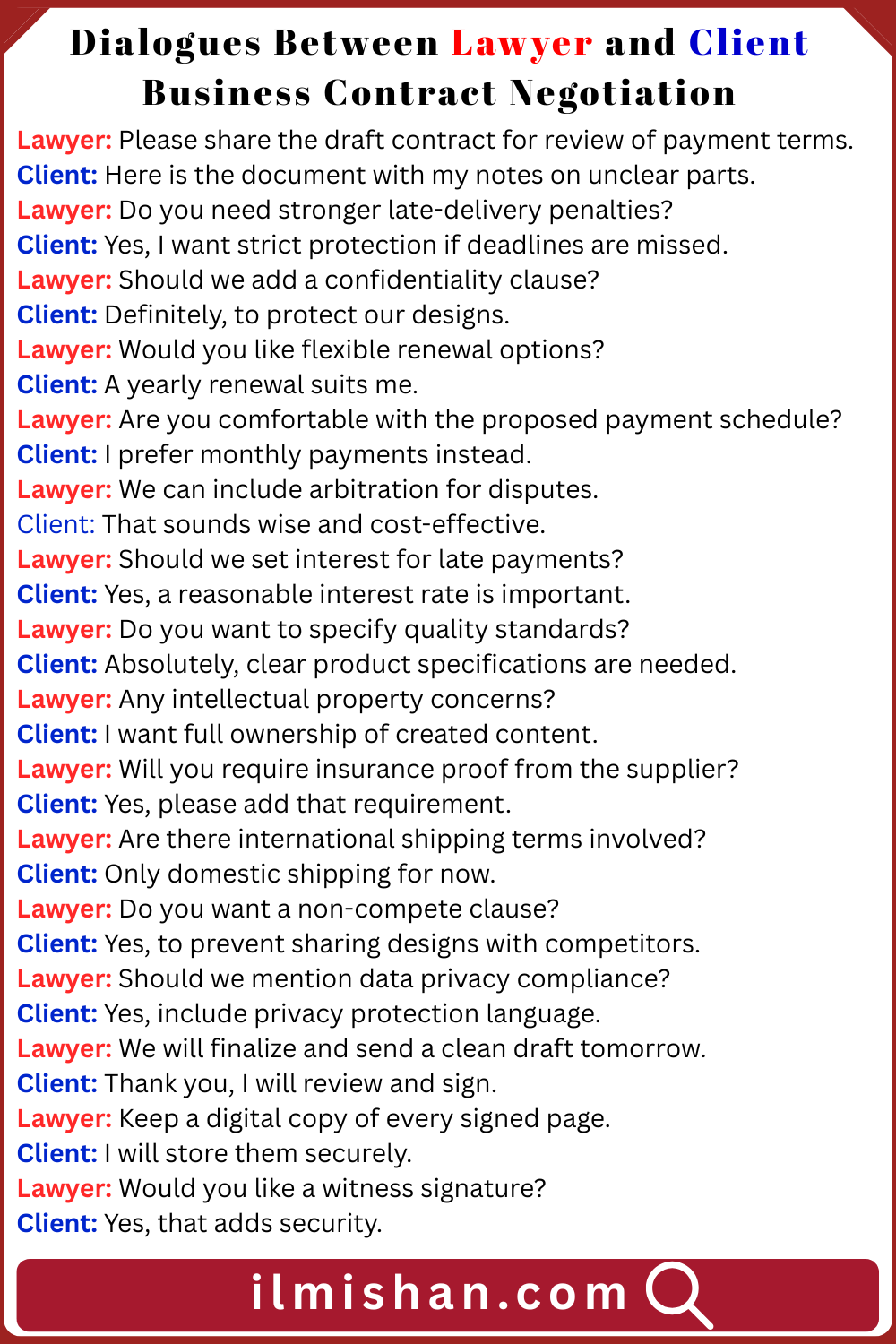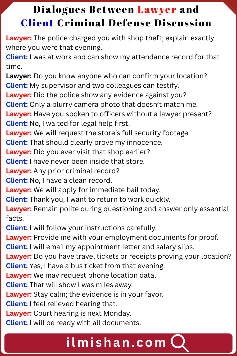 Understanding how a lawyer and a client talk to each other is important for anyone who may need legal help. These conversations show how questions and answers flow when discussing issues like contracts, property matters, or court cases. In this article, you will find clear examples of lawyer between client dialogues written in easy English, along with helpful pictures to make each situation more vivid. This guide can help students, teachers, and anyone curious about legal discussions learn new vocabulary and see how real legal conversations happen in everyday life.