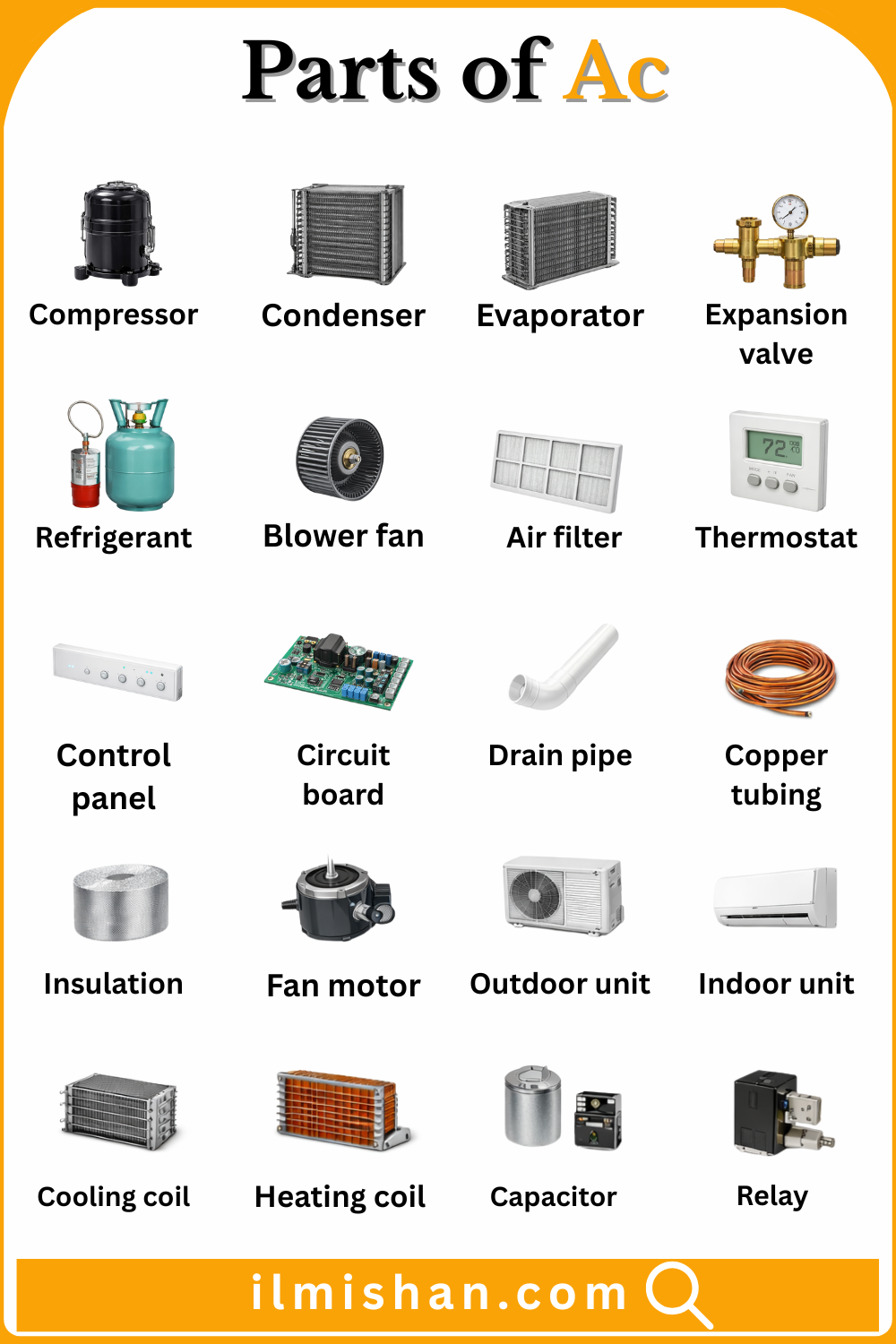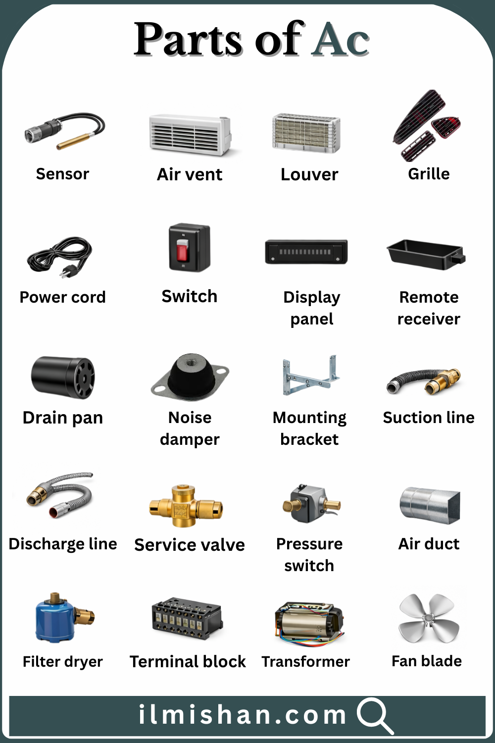 An air conditioner, commonly known as an AC, is an important appliance used to keep indoor spaces cool and comfortable. It works through different parts that perform specific functions such as cooling, airflow, and temperature control. Learning the names of AC parts in English helps students and beginners understand how this machine works in daily life. In this article, you will learn the main parts of an AC with their English names and clear pictures. These visuals make it easier to identify each part and understand its role in a simple and practical way.