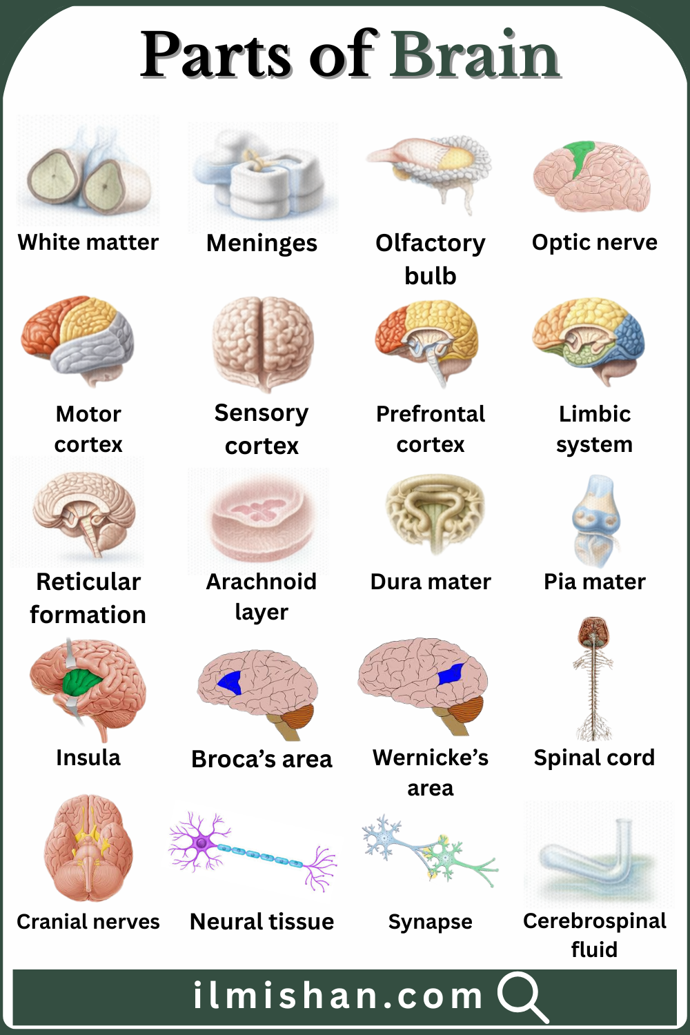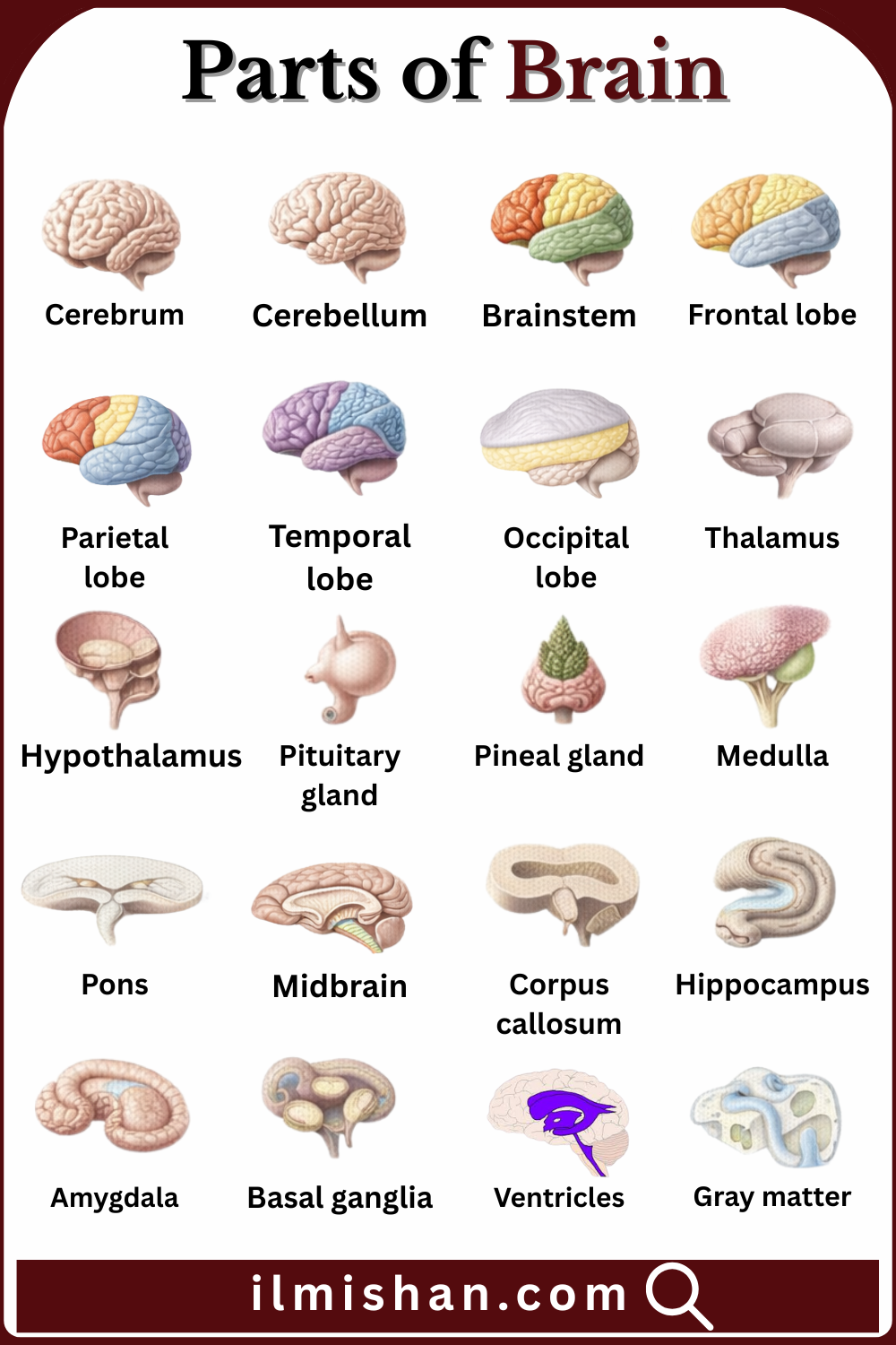 The brain is the main control center of the human body, responsible for thinking, memory, movement, and emotions. It sends and receives signals that help the body work properly. The brain is made up of different parts, and each part has a special function, such as controlling balance, breathing, or decision-making. Understanding the parts of the brain helps us learn how our body and mind work together. In this article, you will learn Parts of Brain with Names in English with Pictures, explained in easy and simple language for clear understanding.