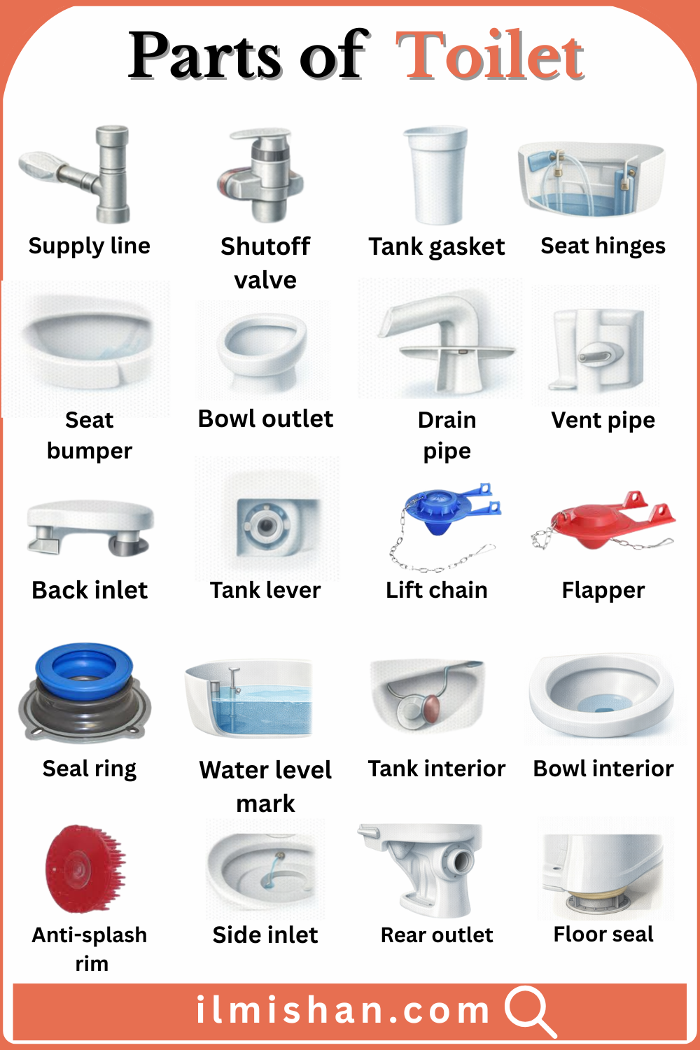 A toilet is an essential fixture found in every home, school, and public place, yet many people do not know the correct names of its different parts. Learning the parts of a toilet in English helps improve daily vocabulary and makes it easier to understand plumbing basics and household maintenance. In this article, you will learn Parts of Toilet with Names in English, along with pictures to help you recognize each part easily. This guide is especially useful for students, teachers, and anyone who wants to use accurate English words in everyday life.