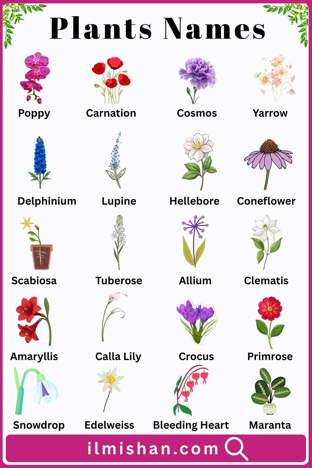 Plants are an important part of our world, giving us clean air, food, beauty, and shade every day. Learning their names in English helps children and beginners easily identify flowers, trees, and garden plants around them. This simple guide shares clear names with colorful pictures, making it fun to recognize each plant and remember it well. Whether for school, gardening, or daily life, knowing plant names builds knowledge of nature and improves English vocabulary in an easy way.