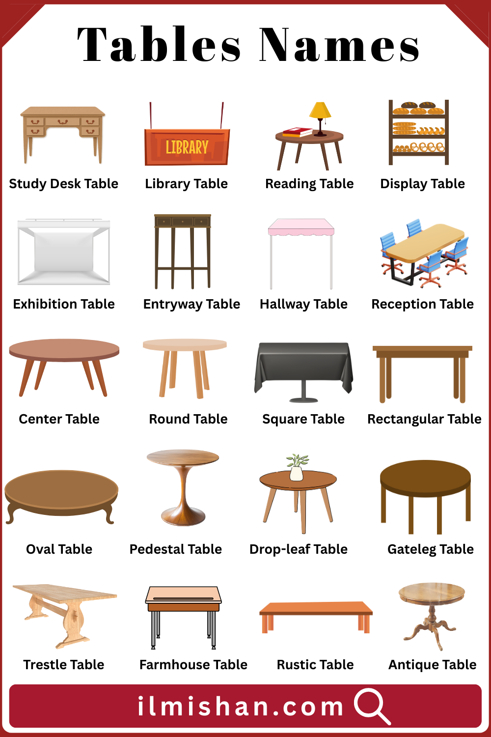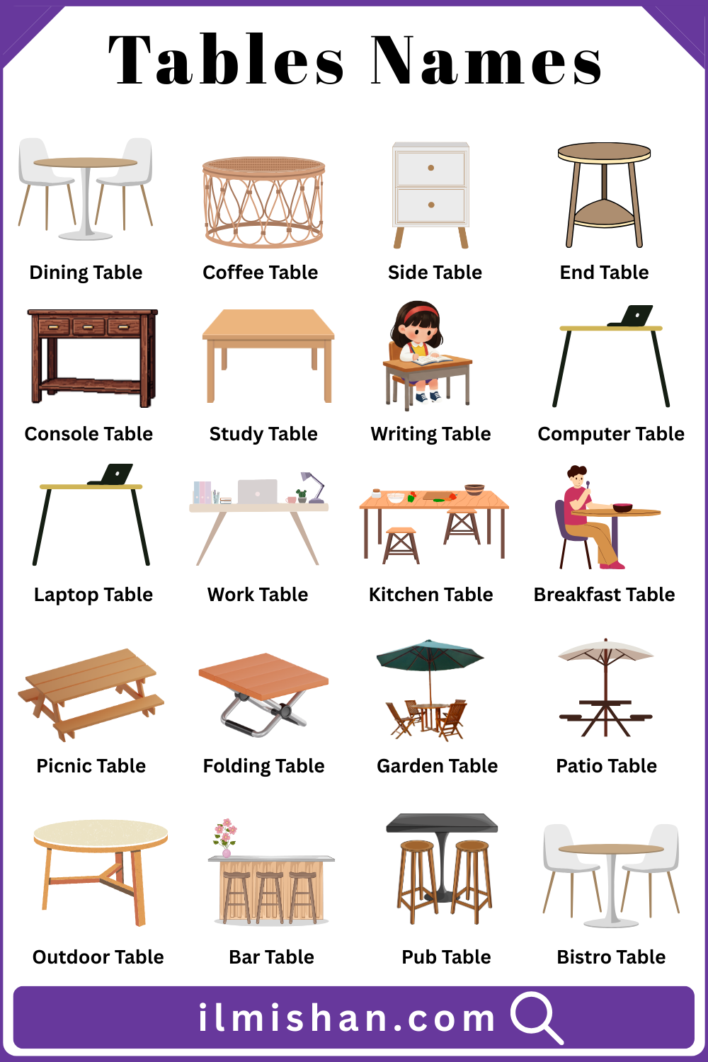 Tables are an important part of our daily life. We see different types of tables at home, school, offices, restaurants, and many other places. Each table has its own shape, design, and purpose. Some tables are used for studying, some for dining, and others for decoration or work. Learning the names of different tables in English helps us improve our vocabulary and understand their uses in everyday situations. In this article, we will learn 60 tables and their names in English with pictures, so you can easily recognize and remember them.