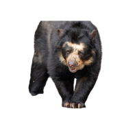A South American bear with light facial markings resembling glasses, living in mountain forests, feeding mainly on plants, fruits, and small animals.