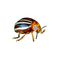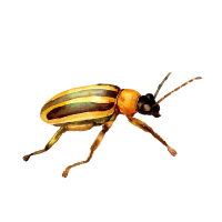 A striped beetle that feeds on potato plants. It is a major agricultural pest and damages crop leaves.