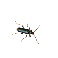 A beetle that releases a chemical causing skin blisters. It feeds on plants and should not be handled directly.