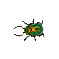 A shiny beetle with metallic colors. It lives on trees and feeds on wood or leaves, admired for its bright appearance.