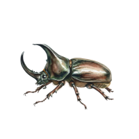 A heavy beetle with a horn on its head. It is strong, lives in tropical areas, and feeds on fruit and plant matter.