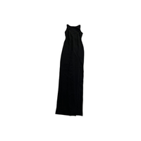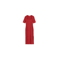 A fitted dress with two vertical slits, often on each side or front and back, adding dramatic movement and a bold, stylish edge for evening or formal occasions.
