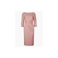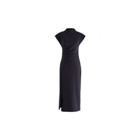 Has a loose, draped neckline that folds gracefully, adding gentle volume and elegance while showcasing the collarbone in a stylish, figure-hugging dress.