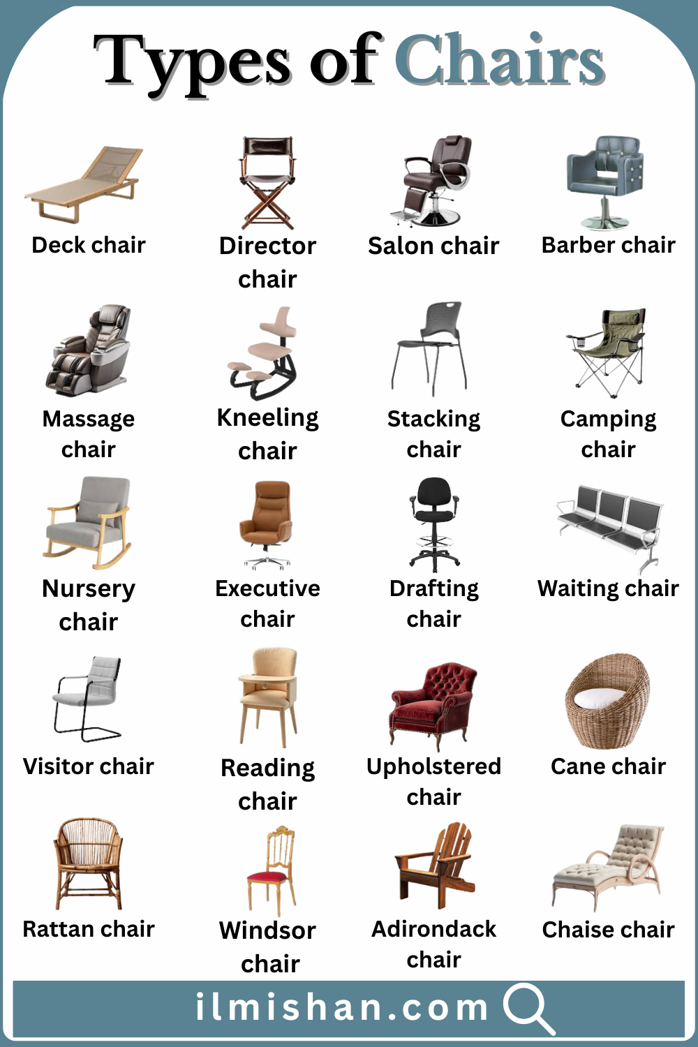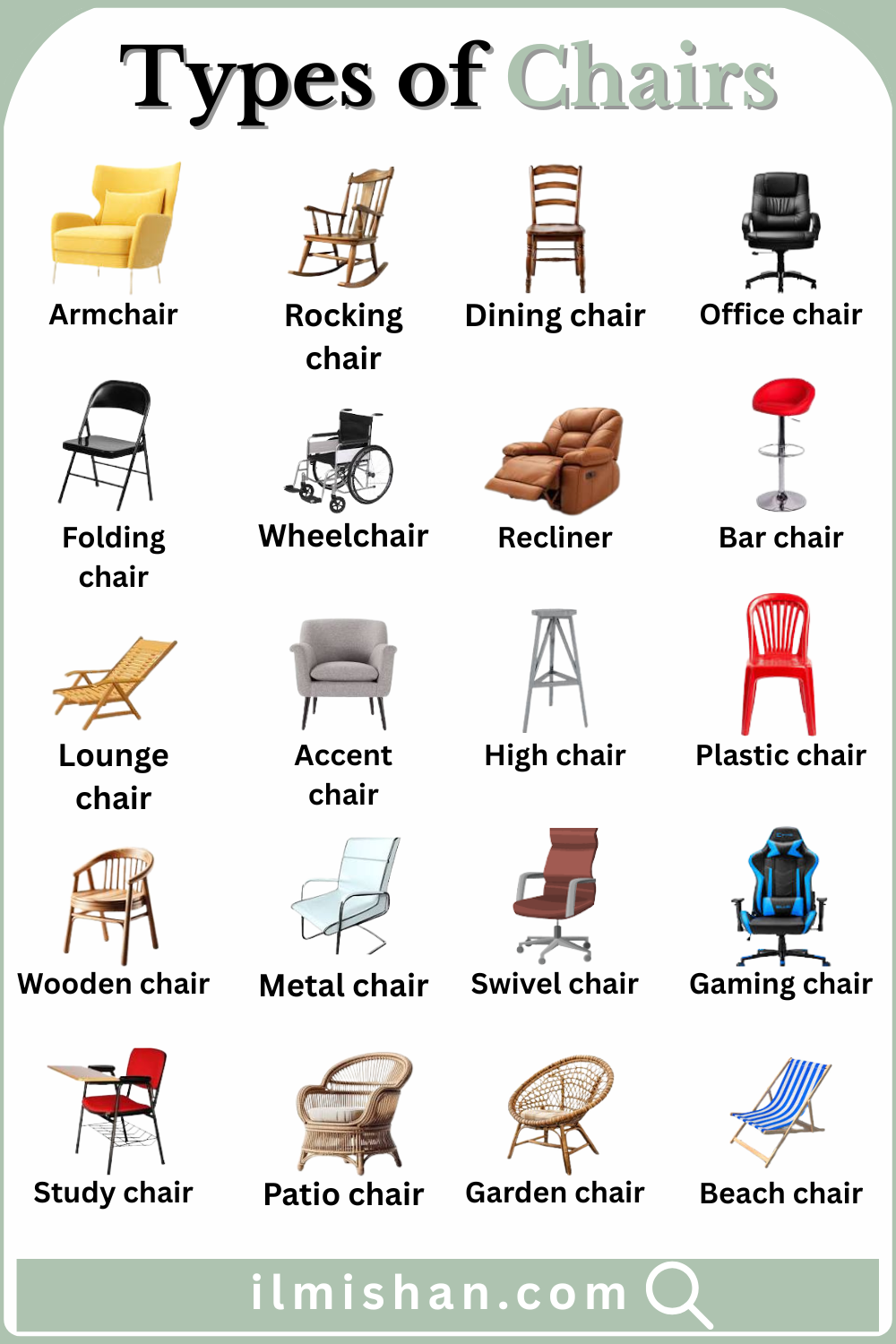 Chairs are common pieces of furniture that we use every day at home, in schools, offices, and public places. They come in many different types, shapes, and designs, each made for comfort, support, or a specific purpose. Some chairs are simple and light, while others are designed for work, relaxation, or special activities. In this article, you will learn different types of chairs with their names in English, along with pictures to help you recognize them easily. This guide is helpful for students, homeowners, and anyone who wants to learn about chairs in a simple and easy way.