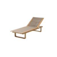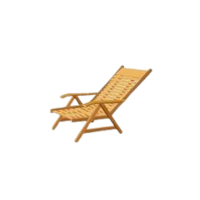 A foldable outdoor chair with adjustable reclining positions, commonly used on decks or beaches, designed for relaxing comfortably in open-air environments.