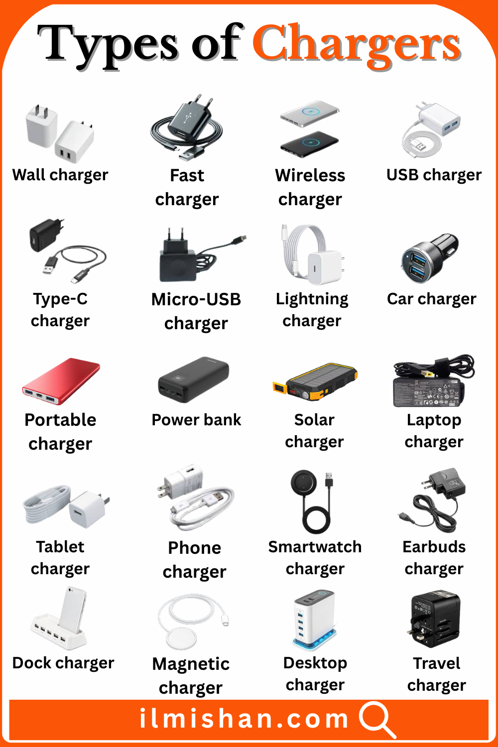 Chargers are important devices that we use every day to power our phones, laptops, tablets, and many other electronic gadgets. There are many different types of chargers, and each one is designed for a specific device or charging need. Some chargers work with cables, while others are wireless or fast-charging. In this article, you will learn different types of chargers with their names in English, along with pictures to help you recognize them easily. This guide is helpful for students, tech users, and beginners who want to understand chargers in a simple and easy way.