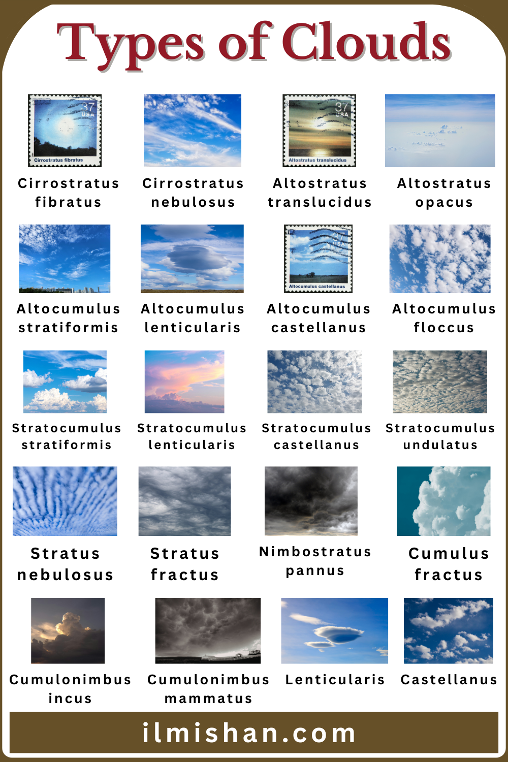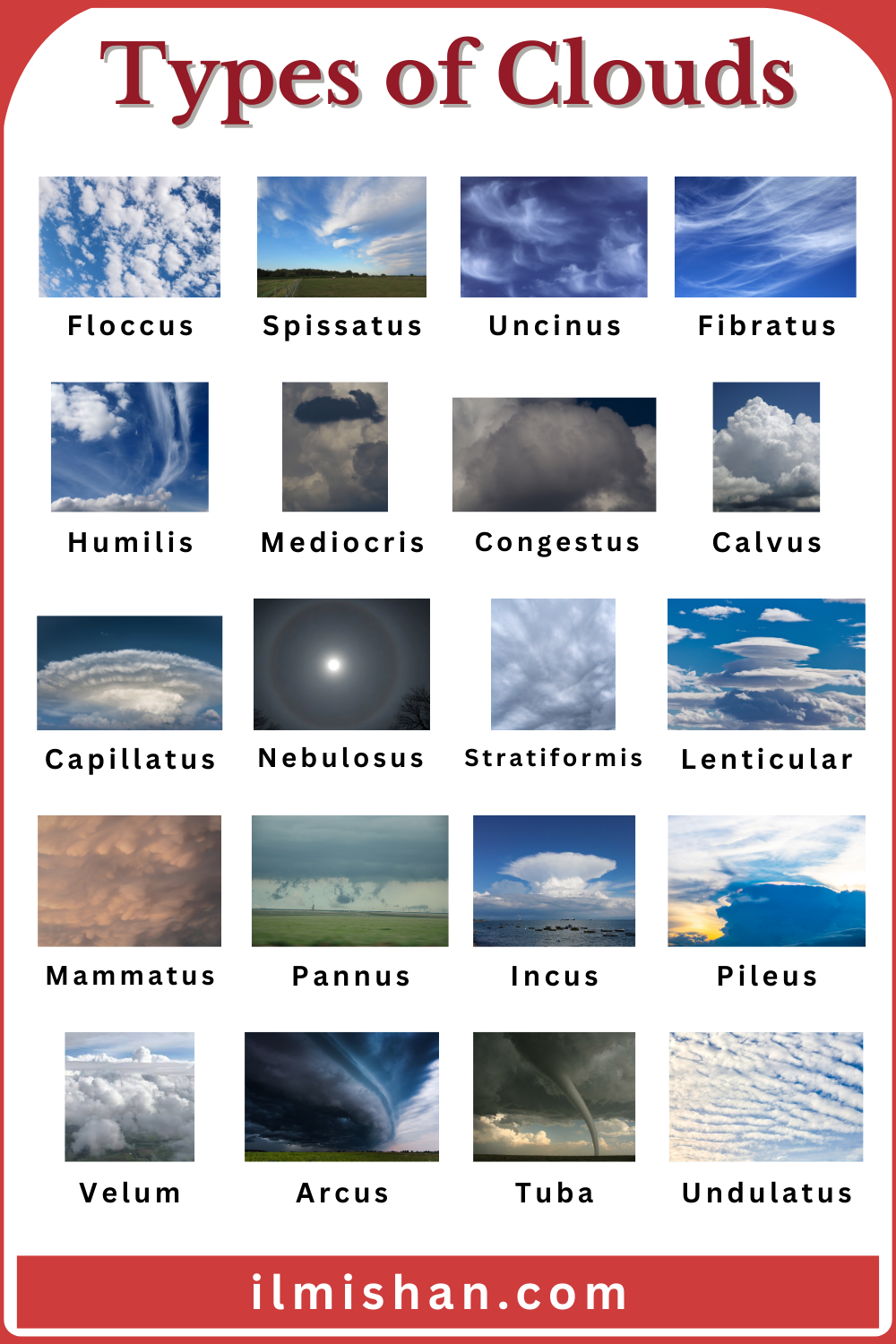 Clouds are one of the most beautiful and fascinating parts of our sky. Every day, we look up and see different shapes, sizes, and colors, but many of us don’t know that each cloud has its own name and meaning. Some clouds bring rain, some bring storms, and others simply float gently on a sunny day. Understanding the types of clouds can help us read the weather and appreciate nature even more. In this article, we’ll learn the main Types of Clouds with Names in English with Pictures, explained in clear and simple language so you can easily recognize them the next time you look at the sky.