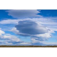 Lens-shaped clouds formed by steady airflow over elevated landforms.