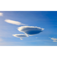 Lens-shaped mid-level clouds formed by air flowing over mountains, often stationary.