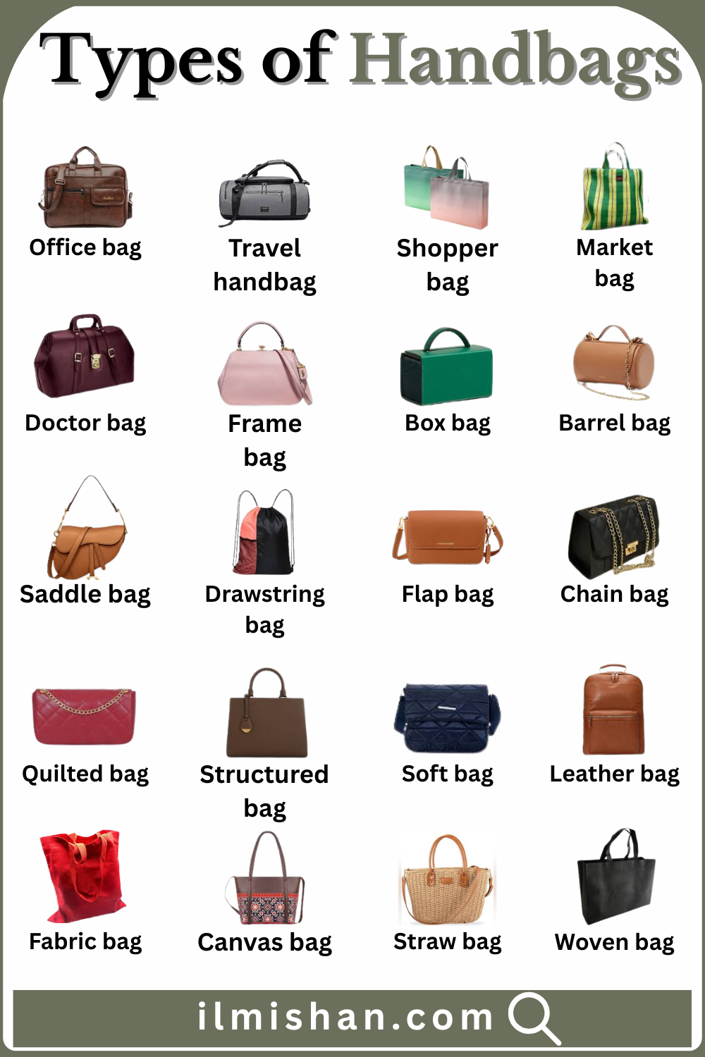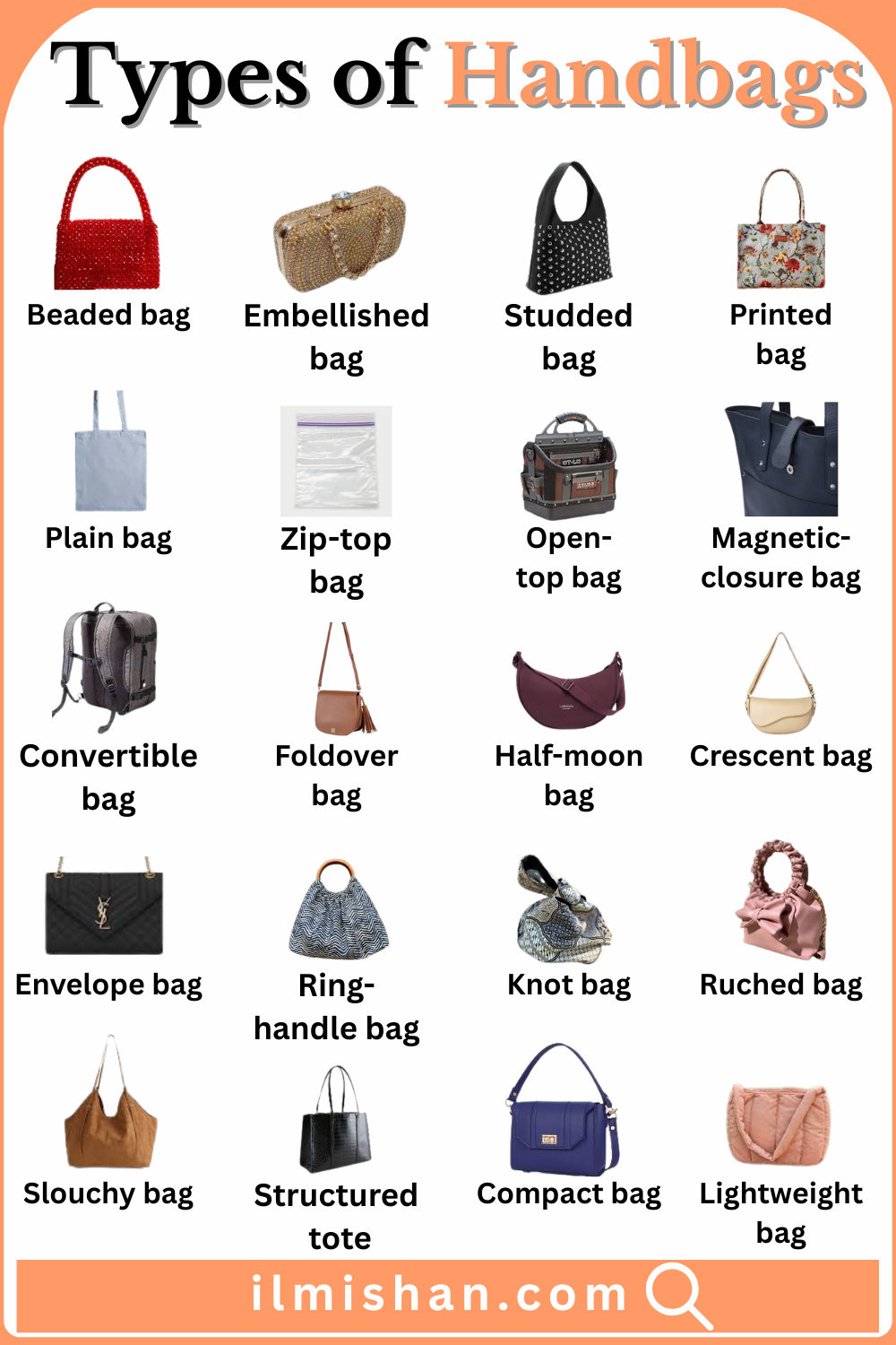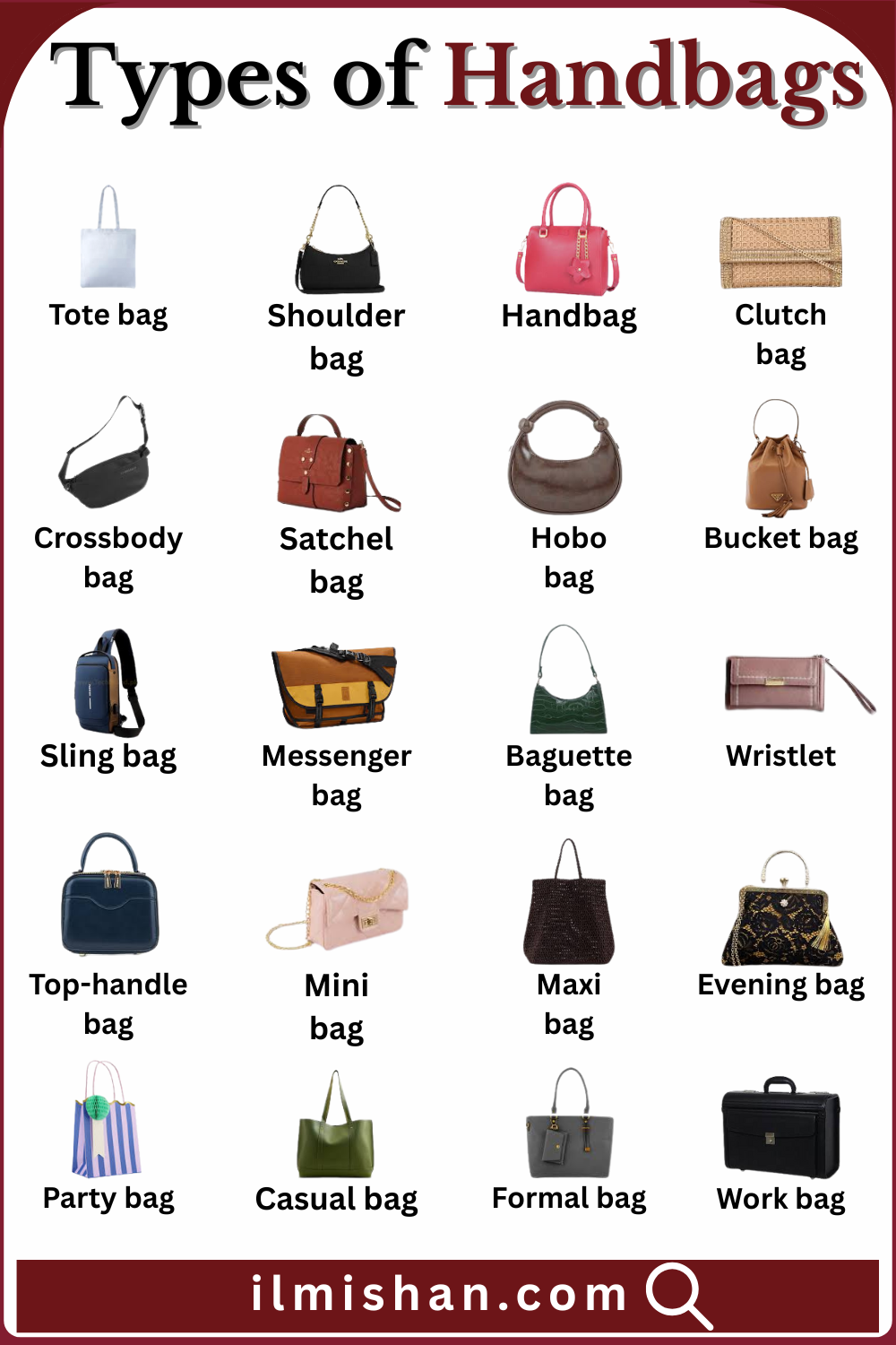 Handbags are an essential fashion accessory used to carry personal items while also adding style to an outfit. They come in many shapes, sizes, and designs, and each type of handbag is made for a specific purpose, such as daily use, travel, work, or special occasions. Learning the names of different handbags in English helps students, fashion learners, and shoppers understand styles more clearly. In this article, you will learn various types of handbags with their names in English and clear pictures, making it easy to identify each bag and choose the right one with confidence.