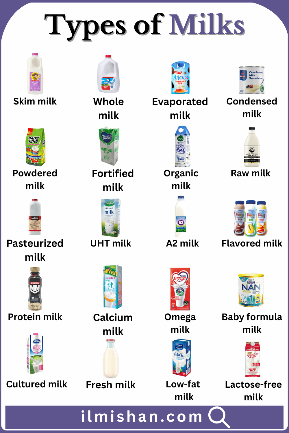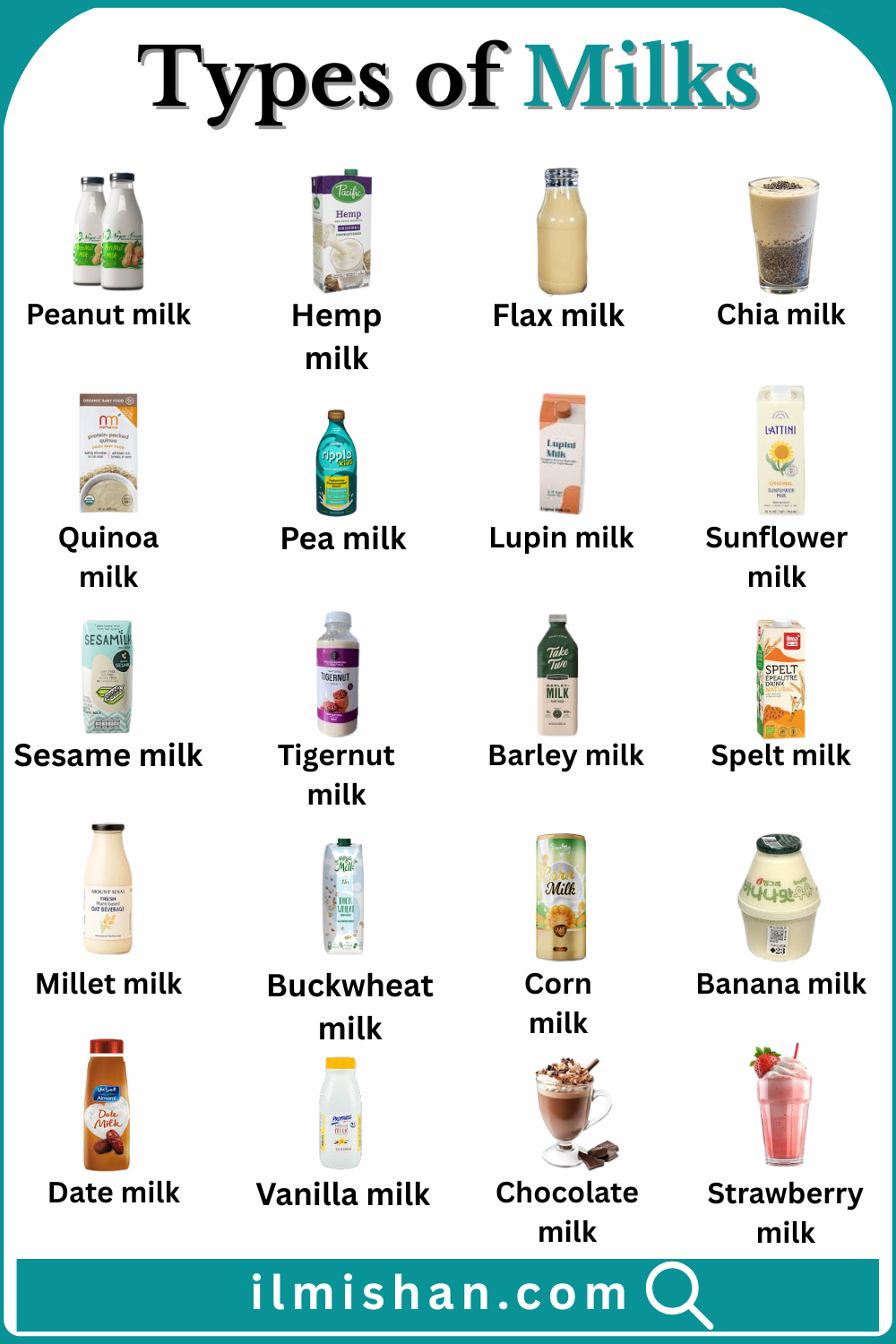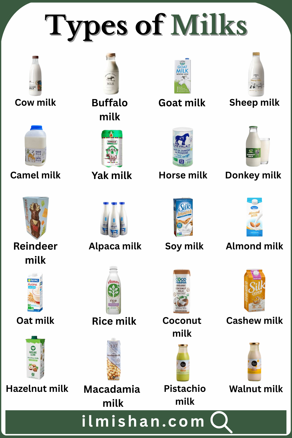 Milk comes in many different types, and each type has its own taste, benefits, and uses in daily life. Some milk comes from animals like cows, goats, and camels, while other kinds are plant-based, such as almond milk or soy milk. People choose different types of milk for health reasons, diet needs, or personal preference. In this article, you will learn different Types of Milks with Names in English, along with pictures to help you recognize them easily. This guide is useful for students, teachers, and anyone who wants to learn about milk in a simple and easy way.
