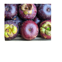 A tropical fruit with thick purple rind and white segments inside, sweet and tangy in flavor, eaten fresh and highly valued for taste.