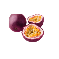 A round fruit with purple rind and aromatic pulp inside, offering sweet-tart flavor, commonly used in drinks, desserts, and sauces.