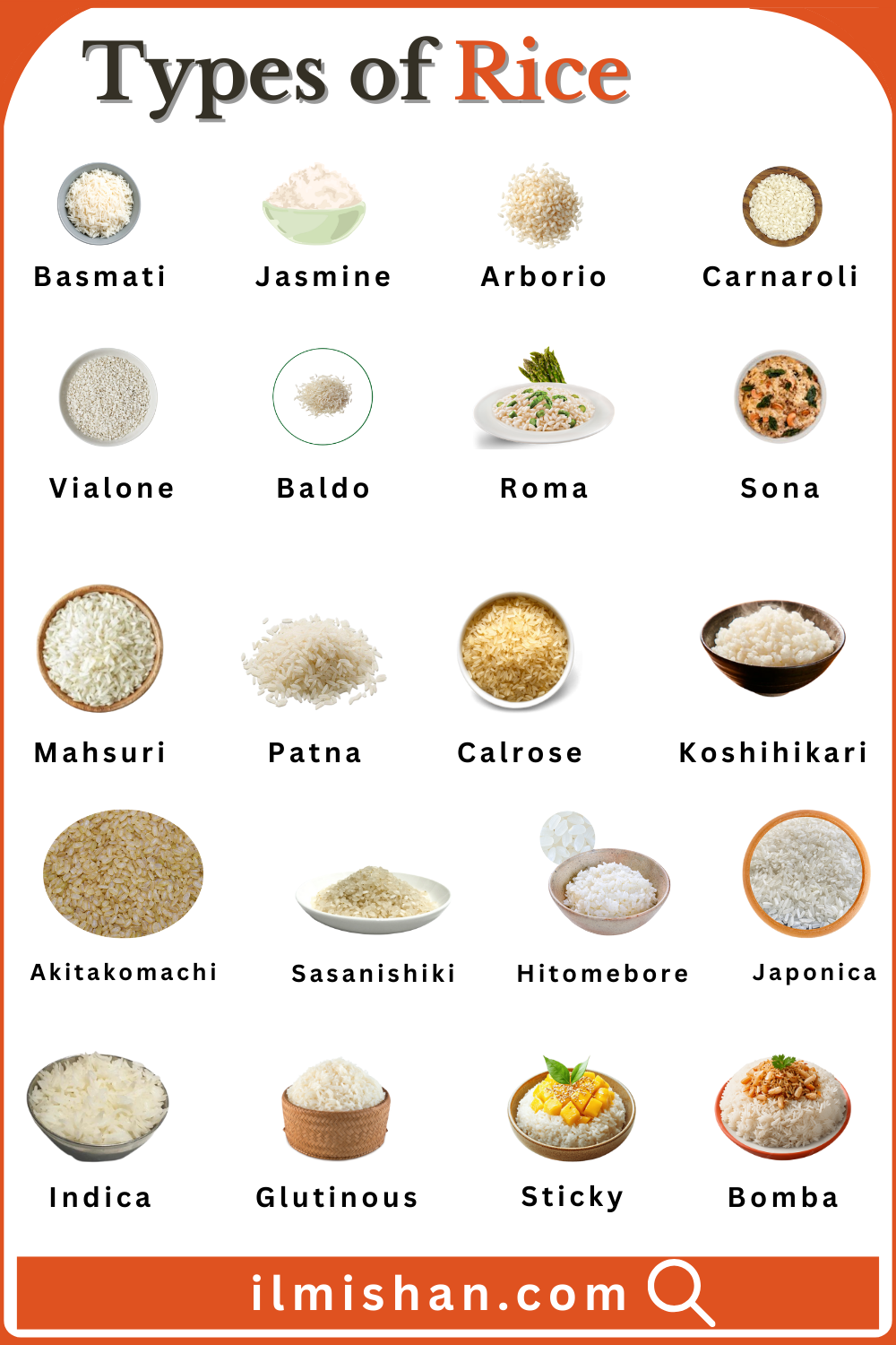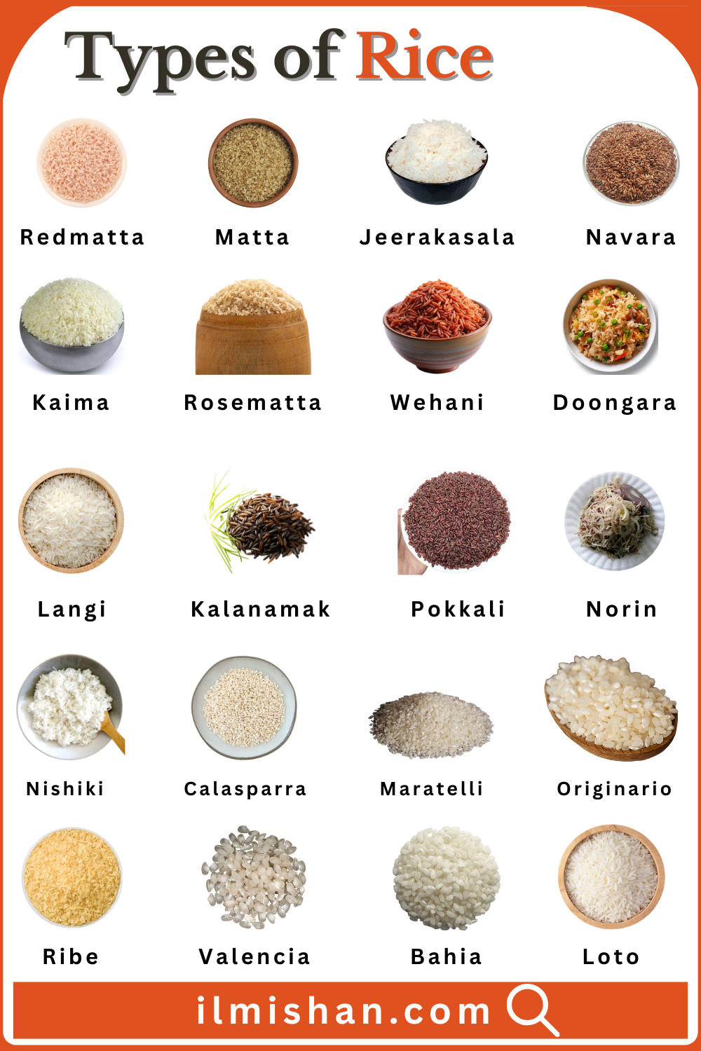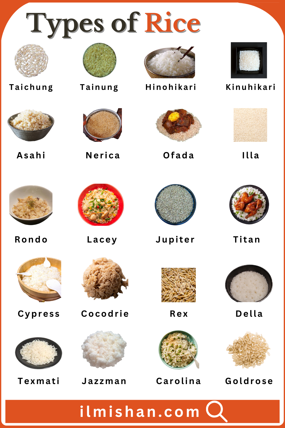Rice is one of the most loved and widely eaten foods in the world, and it comes in many different types, each with its own taste, shape, aroma, and use. From daily home cooking to special traditional dishes, the choice of rice can completely change the flavor and texture of a meal. Some rice varieties are long and fragrant, some are short and sticky, while others are known for being healthy and fiber-rich. Understanding the different types of rice helps you choose the right one for biryani, fried rice, risotto, sushi, or simple boiled meals. In this article, we will learn the main types of rice with their names in English, along with clear explanations to help you easily recognize and use them in your cooking.
