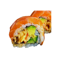 Sushi roll featuring salmon, avocado, and cucumber, often inside-out, highlighting fresh fish flavor and smooth texture in a simple, modern style, commonly served chilled in casual sushi dining settings worldwide.