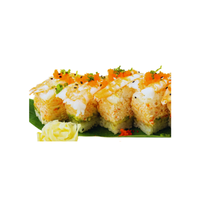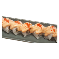Sushi roll containing tempura shrimp or seafood with spicy sauce, delivering explosive flavor, heat, and crunch in each bite, popular among fans of bold, spicy sushi rolls in modern restaurants.