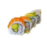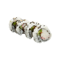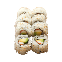 Modern sushi roll featuring crab, avocado, and cucumber, usually inside-out, created to suit international tastes and widely popular worldwide.