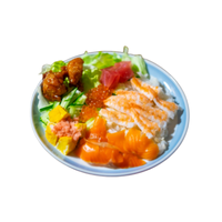 A bowl of sushi rice topped with assorted raw fish and garnishes, offering a fresh, unrolled presentation with varied textures.