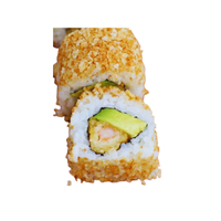 Sushi roll topped or filled with crispy bits, tempura flakes, or fried coating, providing strong crunch alongside soft rice and fillings for added texture contrast and satisfying bite experience overall.