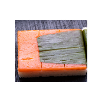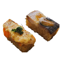 Sushi made by pressing rice and fish together using molds, creating compact layers, then sliced into neat portions, commonly found in regional Japanese cuisines with traditional preparation methods and presentation.