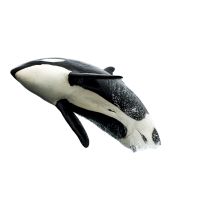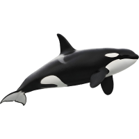 A large black-and-white dolphin often called a whale. Orcas are powerful hunters living in groups and feeding on fish and marine animals.